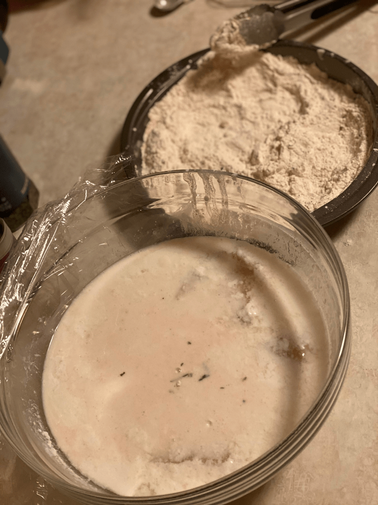 Once your chicken is cut and thinned out cut into the size you want for your biscuits put your buttermilk mixture into a gallon size storage bag and add chicken slowly as to not splash mixture, place in the refrigerator for a minimum of 3 hrs. or even overnight. If you do use the vinegar mixture just a few hours is best as the vinegar breaks down the chicken.